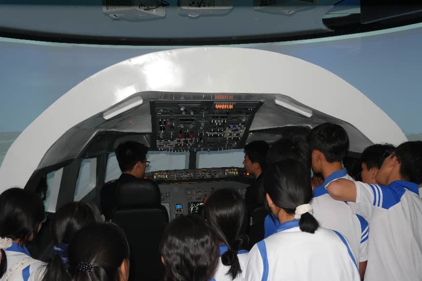随后,师生们前往公教楼前的波音737“智华号”教学训练基地,近距离接触这架从民航运输航线上退役的波音737-300型客机。讲解员为同学们逐一讲解空速管、起落架、发动机、襟缝翼等外部关键部件的功能,帮助同学们快速建立对飞机整体结构的认知。在工作人员的引导下,同学们有序登上飞机,先后参观驾驶舱、客舱等核心区域,亲手触摸驾驶杆、仪表等设施,直观感受飞机操控逻辑与客舱设计细节,真切体会航空工业的硬核实力。